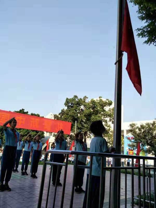 精神煥發的升旗手和國旗護衛隊邁著矯健的步伐,護衛五星紅旗走向升旗臺。在高亢激昂的國歌聲中,鮮艷的國旗冉冉升起,大家懷著激動的心情目視國旗唱著國歌,隨著國旗緩緩升起,愛國情感在每個人心中升騰。隨后,大家一起揮動手中的五星紅旗,齊唱《我和我的祖國》,祝愿著我們的國家更加繁榮昌盛,和諧富強。國旗下,六(3)班賈尚美同學為我們描述了新中國的成長歷程,讓我們每一位師生都因祖國而驕傲和自豪。陳麗娥副校長強調,作為新時代的我們要勇敢的肩負起新的時代賦予我們的歷史責任,時刻要不忘初心、牢記使命。緊接著,甘群帶主任帶領全體師生共同呼號:祖國萬歲!祖國萬歲!全體師生用激情澎湃的呼號聲來表達自己對祖國的無盡熱愛。