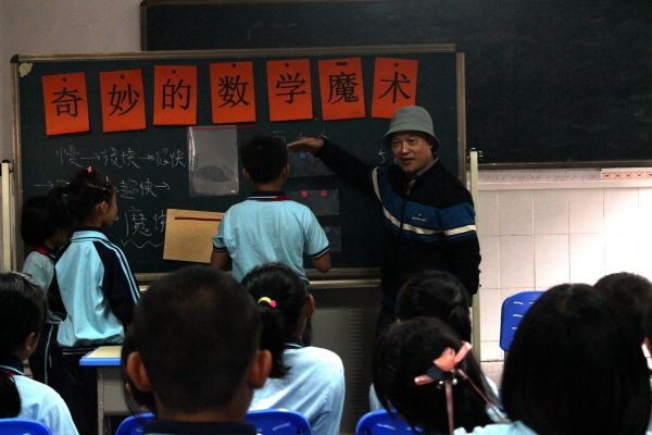 此次教研活動分為兩個環節。第一個環節由趙龍山教授為我們展示一節精彩的數學課《奇妙的數學魔術》。課堂上,趙教授以“魔力撲克牌”引入,首先激發了孩子們的興趣。接著和孩子們一起玩“沙里淘金淘雙王”的魔術,說數找雙王,通過拆數,過牌,制造奇跡,準確地找出雙王。最后,趙教授通過探秘變魔術的過程,讓學生懂得在數學學習過程中觀察的重要性。整節課,學生在輕松愉悅的氛圍中既鍛煉了觀察能力、思維能力和邏輯推理能力,又在活動中體驗到了數學無窮的樂趣。第二環節是趙老師的“我與學生玩數學”專題講座。趙教授告訴我們數學魔術課就是運用多種策略引領學生體驗數學學科的無窮奧秘,從游戲中學習知識、提高技能,在參與魔術體驗的過程中尋找數學答案,由此揭開數學的神秘面紗,體驗數學的魅力。