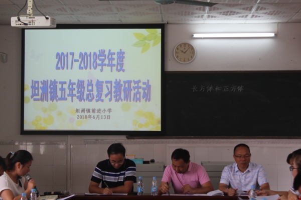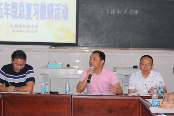 為了迎接中山市教育和文體局對全市五年級學生進行質量監測,為了使老師更好的進行期末總復習,6月13日,坦洲鎮五年級總復習的教學研討活動在坦洲鎮前進小學舉行。坦洲鎮數學教研員劉偉光老師、坦洲名師工作室肖相橋老師、前進小學郭炳森校長和前進小學許思科副校長出席了本次活動,一起參加活動的還有全鎮五年級奮戰一線的數學老師和前進小學全體數學老師。