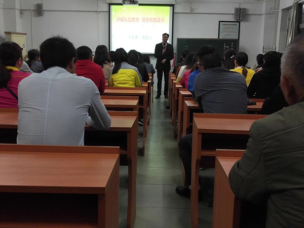 首先,由中山市家庭教育指導服務中心教師鄭金山老師進行主講。鄭老師為全校家長們作主題為《開展禮儀教育,培養優雅孩子》的專題講座。鄭老師在講座中指出:禮儀使人文明,道德使人高尚。鄭老師分別從兒童禮儀的基本動作、禮貌用語、個人禮儀、交往禮儀、家庭禮儀、公共場所禮儀等方面,給家長提出了許多關于兒童禮儀教育的方法建議,為規范孩子的文明舉止、提升孩子的素質和自尊,作出了明確的指導。同時鄭老師希望每位家長都能以身作則,用自己的實際行動為孩子做好榜樣。