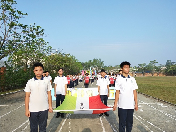 10月26日,秋高氣爽,晴空萬里。坦洲三中全體師生齊聚體育場,隆重舉行了第二十一屆秋季運動會。本屆校運會的進場儀式在激昂的《運動員進行曲》中開始,最先入場的是國旗隊、校旗隊、校訓隊,朝氣蓬勃的紅旗方隊,旗手們昂首闊步,高舉飄揚的旗幟進入會場。鮮花隊、彩旗隊緊隨其后,激情洋溢、活力四射。接下來全校按班級組成的8個運動員方隊在各班主任的帶領下,邁著矯健的步伐、喊著響亮的口號,精神飽滿的接受校領導們的檢閱。主席臺前,他們用豐富多彩又極具創意的歌舞、口號展現班級的精神風貌。最后出場的是意氣風發的教師裁判方隊,他們微笑著向會場揮手致意。