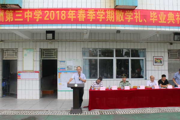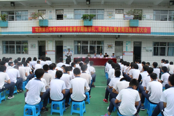 2018年7月6日,坦洲三中在教學樓前舉行了2018年春季學期畢業典禮暨散學禮儀式。典禮由校德育副主任彭峰老師主持,坦洲三中全體師生以及坦洲鎮磨刀門水上邊防派出所林林警官參加了此次典禮。