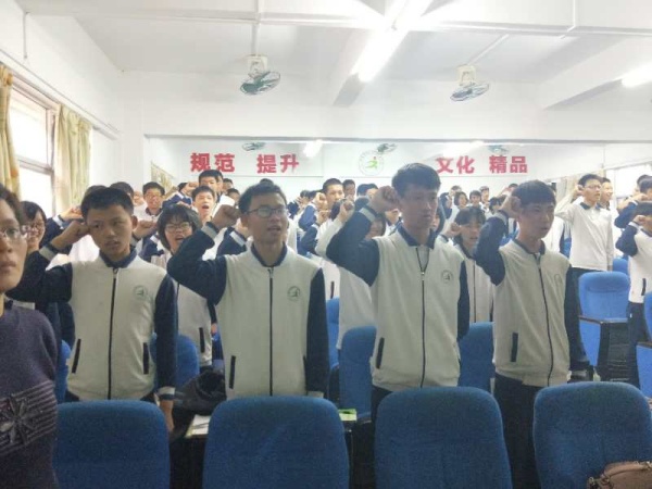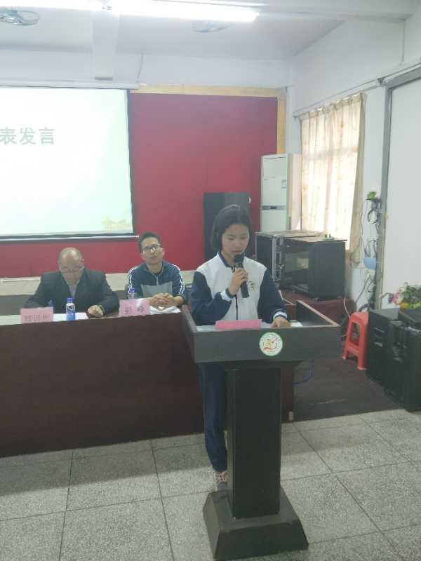 會議由年輕漂亮、才華橫溢的吳瓊老師主持。首先,全體師生觀看激勵短片《雄鷹蛻變》。短短2分多的時間,向同學們展示了雄鷹在150多天內如何經歷一個痛苦的重生過程,重新再次飛翔30年。學生代表陳家雯同學借用一些同學們的困惑與名人的事例向同學們發出號召,表達了生地中考必勝的決心!