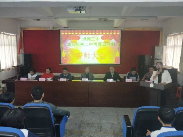 陽春三月,春暖花開。2018年3月13日周二第九節,坦洲三中初二級全體師生在階梯室隆重舉行了“坦洲三中2018年初二地理、生物中考百日沖刺誓師大會”。大會主要分為七個環節:奏唱國歌、觀看激勵短片、學生代表講話、教師代表講話、學生宣誓、鄭訓彬副校長講話、學生簽名活動。