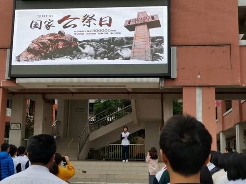 接著鄒進(jìn)輝老師以自己86歲的奶奶為例子,深度講述當(dāng)年與自己奶奶是同齡人的南京人民當(dāng)時(shí)的悲慘遭遇,講述了今天大屠殺幸存者在不斷地減少,但我們不能因此而忘記歷史,而是應(yīng)該從南京大屠殺這段悲痛的歷史中吸取經(jīng)驗(yàn)教訓(xùn),銘記歷史,奮發(fā)圖強(qiáng),落實(shí)家國(guó)情懷核心素養(yǎng)教育。最后,警笛鳴起,全校師生共同為南京大屠殺遇難者默哀。