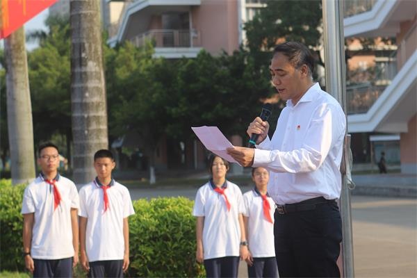 學校黨支部書記、校長梁格青在國旗下做主題講話,回望新中國歷史,70年風雨兼程,70年砥礪奮進,70年接續奮斗,在中國共產黨的領導下,中華民族迎來了從站起來、富起來到強起來的偉大飛躍,中華大地發生了翻天覆地的歷史性巨變。梁校長寄語同學們立志報國,將自己的“青春夢”與“中國夢”相結合,投身偉大祖國建設,創造更多更大的輝煌。