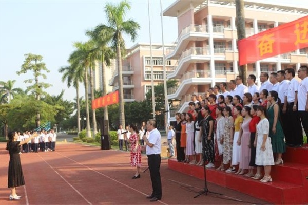 上午8時,在激昂雄壯的義勇軍進行曲中,鮮艷的五星紅旗徐徐升起,在晨風中高高飄揚。全校2300多名師生正裝肅立,向國旗行注目禮,高唱國歌,以這種莊嚴神圣的方式表達對偉大祖國的崇敬和熱愛之情,為偉大祖國送上深情祝福。