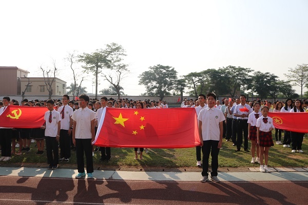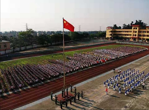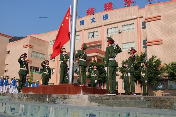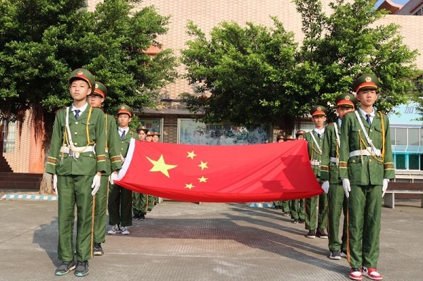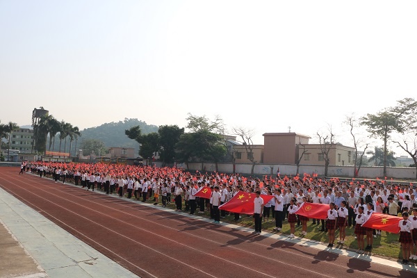 活動在一陣美妙的奏樂聲中開始,鼓號隊穿著盛裝排著整齊的隊伍,用最熱情洋溢的節拍迎接國旗護衛隊的閃亮登場,旗手們精神抖擻、神采飛揚,邁著整齊的步伐向我們走來了,在雄壯的國歌聲中,國旗緩緩升起,師生們熱情高漲......全校近3000名師生員工一起高呼吶喊“祖國萬歲!”“祖國萬歲!”,聲音響徹云霄。何偉華副校長做主題講話,他慷慨激昂、滿懷深情的講述了中國如何歷經磨難和屈辱,一路從泥濘黑暗中走來,走向光明和富強!走到了今天中華人民共和國成立70周年,真正的給師生們上了一節生動的思想政治課。何副校長最后告誡同學們:“不忘國恥,奮力拼搏!不忘初心,牢記使命!少年強則國強!我們要愛國敬業,爭做有為的新一代!”。接著是“文明班級”、“雅行之星”頒獎儀式,同學們收獲了滿滿的成就感;最后,張榮炬主任強調國慶長假的安全要求,他要求同學們時候樹立安全第一的思想,結合日常生活實際,從各方面提出了注意事項和具體要求,確保師生們度過一個愉快安全的假期。