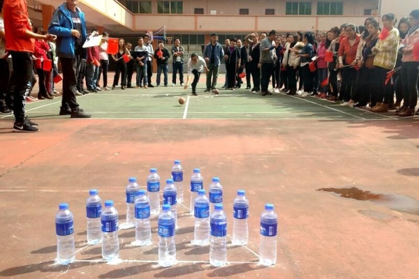 比賽開始了。只見平時溫文爾雅的教職工紛紛挽袖上陣,參與到比賽中去。第一個項目是“接力投擲”,只見四名“空投手”站在起跑線上向四名“搬運手”投擲沙包,“搬運手”用筐子準確地接住,然后快速地跑向五米處的投擲線,沙包交給“投擲手”,“投擲手”將沙包瞄準積分布進行投擲,爭取投到高分數(shù)。場上加油聲不斷,充滿了老師們的歡聲笑語,每個人的臉上都洋溢著快樂的笑容。第二個項目是“打保齡球”,參賽教師分組將“保齡球”滾向15米外的15瓶礦泉水瓶,努力擊倒更多的球瓶,從而得到更高的分數(shù)。觀看的老師及職工趣味盎然,紛紛給參賽隊員打氣助威,球瓶被擊中后,全場就會響起一片歡呼聲和鼓掌聲。