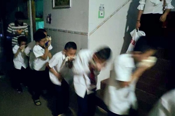 當天晚上8點,宿舍三樓模擬煙火燃起,寬敞明亮的宿舍突然漆黑一片。隨著一陣急促的警報聲,指揮員發出了逃生指令:“同學們注意,現在宿舍發生了火災,請大家按照指定的路線,安全有序地撤離到樓下籃球場!”正在宿舍休息的全體宿生,反應迅速,馬上按照宿舍管理員“掩住口鼻、彎腰前行、有序小跑”的要求,在管理員及老師的指揮下,迅速用濕毛巾捂住口鼻,彎下身子,按照預定的緊急疏散路線,快速而有序地從公寓撤離到操場指定地帶。緊急疏散演練活動收到了預期效果。
