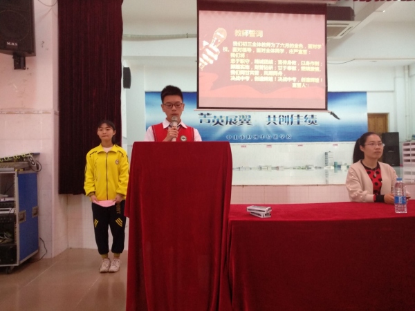 教師代表郭英、學(xué)生代李嘉豪也相繼發(fā)言,發(fā)言中不難看出,初三全體師生都必將在2018中考備考過(guò)程中全力以赴、奮勇拼搏。過(guò)程中初三全體老師及同學(xué)們還進(jìn)行了莊嚴(yán)的宣誓,展現(xiàn)了他們面對(duì)2018中考勇往直前、舍我其誰(shuí)的堅(jiān)定信念。