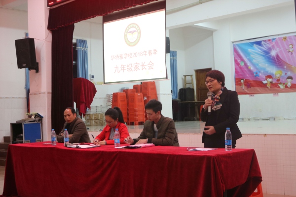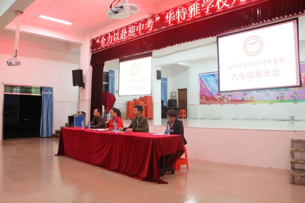 隨著2018年中考臨近,學校各項備考工作正緊密的進行,為了進一步提高初三備考工作的成效,促進家校之間的密切配合,共同做好學生的教育工作,3月9日晚,華特雅學校組織召開了初三畢業班家長會,初中部教務主任段銀燈、德育主任鄧財秀、初三全體老師及家長們出席了本次會議。