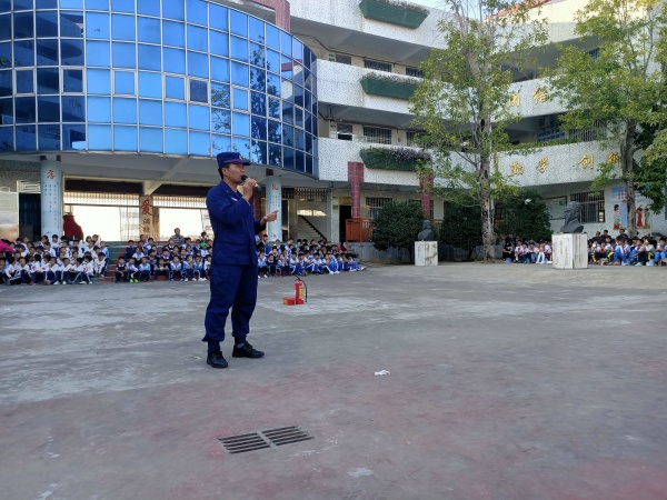 接著,坦洲鎮消防中隊盧警官給全校師生進行消防安全普及專題講座。講座主要圍繞火災案例分析、火場逃生方法普及以及滅火器的使用三個方面展開。他以通俗幽默的語言與同學們展開互動,并以生動真實的案例告誡大家:生命不重來,安全最重要。隨后盧教官向所有同學現場演示消防設備的使用技巧及注意事項,并指導部分老師和同學正確使用干粉滅火器。觀摩的師生通過聽取消防安全常識講解及參加現場滅火,消防安全意識和基本消防常識得到增強,同時掌握了基本滅火方法,同學們不僅懂得了著火要如何自救、如何逃走、如何撥打119電話,而且還學會遇事不慌張、不害怕,沉著冷靜。最后,余校長對此次疏散演練活動進行了總結,提出了學校安全工作的進一步要求。