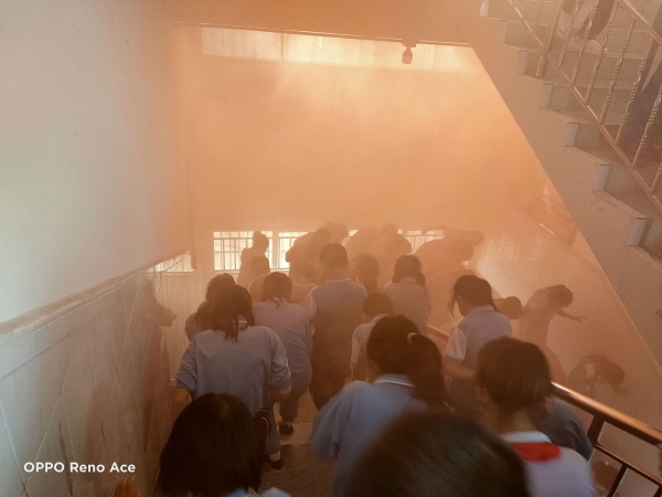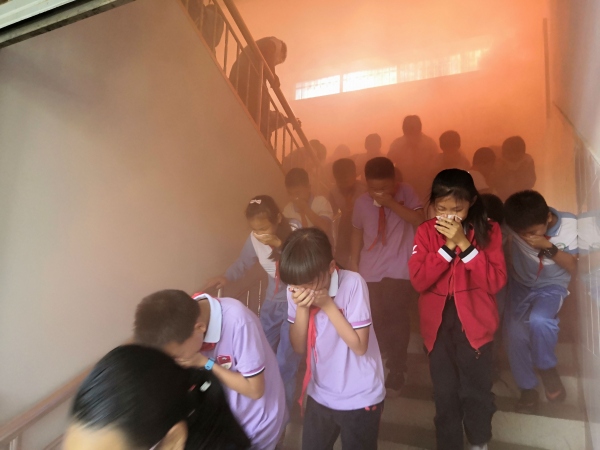 隨著煙霧升起、消防警報聲的響起,各班教師依據疏散路線快速、有序地帶領學生用濕毛巾捂住口鼻、彎下身體,沉著有序,在短短幾分鐘里全校六百多名學生全部撤離到了規定的安全地點,收到預期的效果。