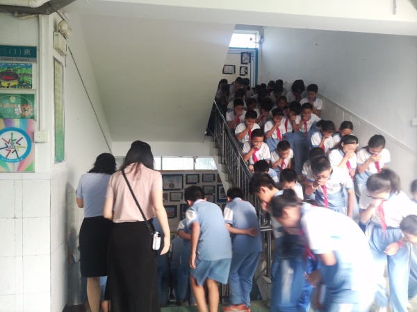 為了實(shí)施好這次演練,學(xué)校制定了詳細(xì)的安全疏散演練方案,對各班逃離的路線及每位配班老師的職責(zé)等內(nèi)容都作了明確的規(guī)定,并強(qiáng)調(diào)一年級的三位班主任提前做好學(xué)生疏散安全教育工作,帶領(lǐng)學(xué)生熟悉路線。上午8時(shí),隨著警報(bào)的響起,各班主任老師迅速到達(dá)各班協(xié)助上課老師一起組織學(xué)生疏散,其他老師們也在第一時(shí)間趕到自己當(dāng)時(shí)所在樓層拐角處配合疏散學(xué)生,安排學(xué)生有秩序地疏散,防止踩踏事件的發(fā)生。各班學(xué)生在老師們的指揮下,彎著腰,貓著步,用手帕、毛巾等捂住口鼻,沿著學(xué)校指定樓梯口快熟快速前進(jìn),有序撤離到學(xué)校操場的安全地帶,耗時(shí)1分49秒,隨著各班班主任清點(diǎn)人數(shù),并層層上報(bào),全校684名師生全部安全疏散完畢。