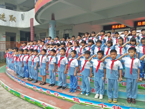 在熟悉而親切的出旗曲中,出旗手邁著整齊的步伐,精神抖擻地進行著莊嚴的出旗儀式,少先隊入隊儀式由此拉開帷幕。隨著雄壯高昂的旋律響起,同學們高唱隊歌,嘹亮的歌聲表達了同學們對少先隊組織的熱愛,緊接著學校大隊輔導員朱文娟老師宣讀了新隊員名單,115名新同學在《星星火炬》的音樂聲中,踏著整齊的步子、意氣風發地走上臺來,老隊員們鄭重地為新隊員系上鮮艷的紅領巾,新舊老隊員互敬隊禮。