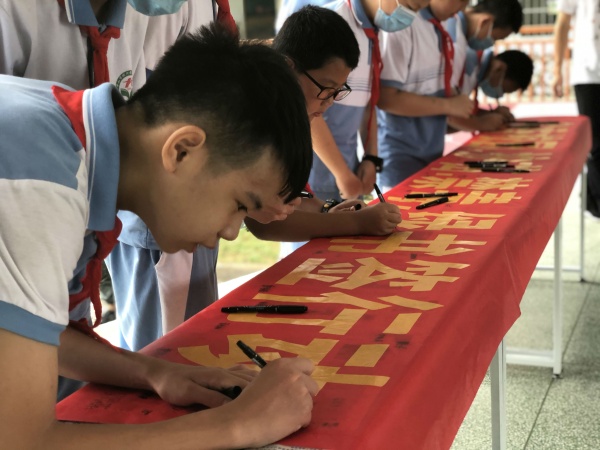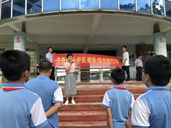 本次活動在莊嚴(yán)的升旗儀式下拉開序幕,學(xué)校德育主任傅嘉賢就活動精神展開講話,教育全體師生掃黃打非從自身做起,組織學(xué)生開展了一次護(hù)苗綠書簽簽名承諾活動。在學(xué)校德育處的組織下,學(xué)校余壁峰校長帶頭簽名,各班同學(xué)分年級進(jìn)行,鄭重地在“書香校園.護(hù)苗.禁毒.綠書簽行動”橫幅上簽上自己的名字。當(dāng)看到懸掛在學(xué)校門口有自己簽名的的橫幅時,學(xué)生們紛紛表態(tài):“我要自覺抵制不良的網(wǎng)絡(luò)信息,做到健康上網(wǎng),同時要多讀正版書籍,為營造書香校園而努力!”
