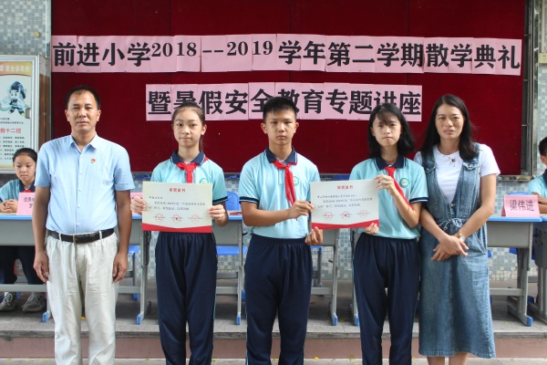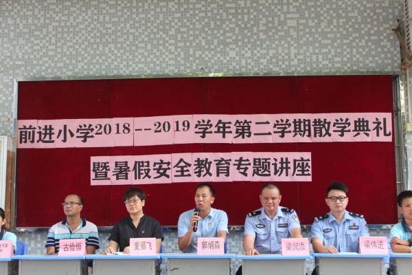 7月5日上午,坦洲鎮前進小學全體師生齊聚在榕樹頭廣場,舉行散學典禮。永前派出所梁潤添、梁偉俊警官,校長郭炳森、教導主任麥麗飛、總務主任古儉恒、優秀學生代表羅曼妮、劉浩恒等列席參加了本次散學禮。