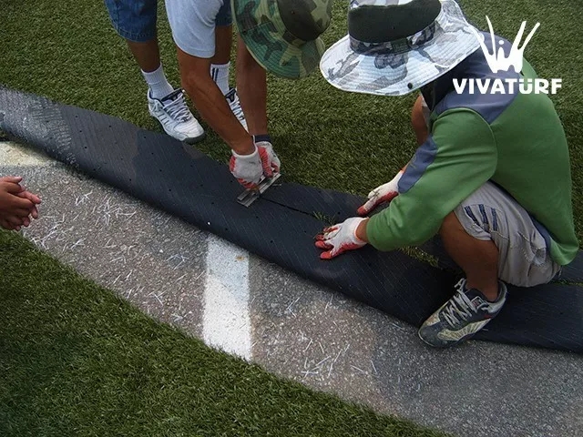人造草坪在拼接過程中掌握好膠水粘接時間,防止草坪粘接劑因長時間未粘合而固化,草坪鋪裝方向保持一致。