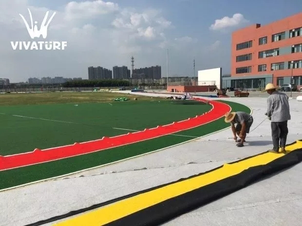 修剪草坪在跑道彎曲位置處的造型,保證人造草坪鋪裝與跑道尺寸一致。同時,草坪鋪裝縱向和橫向接縫處不可有漏膠現象,用專用灌膠筒修補。