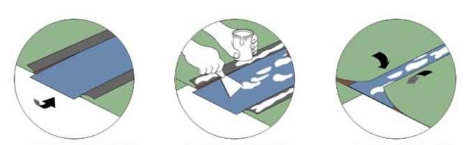 2、將相鄰的草皮邊均勻向上卷起20cm,用刷子和刮板在草皮背面和其下方的接縫布上均勻涂抹膠水(在這里要注意膠水的使用量,量少會使得黏合不夠牢固,量多則容易溢出,粘到草絲);