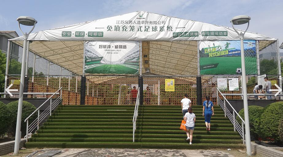 在威騰草坪所在的無錫國家工業(yè)設(shè)計(jì)園創(chuàng)意園園區(qū)內(nèi),一座可拆卸式的籠式足球場在樹木掩映中悄然矗立,四面圍網(wǎng)+封閉式頂棚使它顯得不那么高調(diào),籠式足球場內(nèi)外蔥翠的人工草坪與周圍的自然植物渾然一體,幾可亂真。