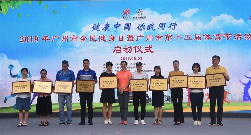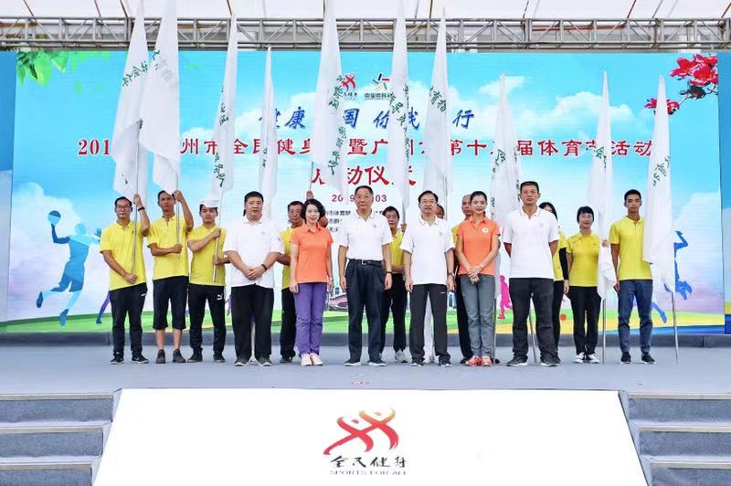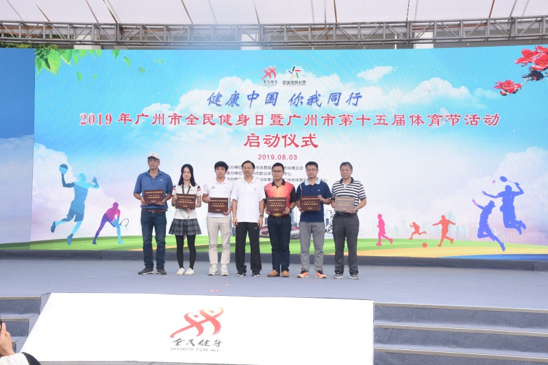啟動儀式上,廣州市政府副秘書長張建華為來自全市11區的社會體育指導員志愿者服務隊代表進行授旗,并宣布活動開幕。廣州市體育局、廣州市體育總會領導分別為獲得“2018年度市屬體育協會年度考核5星級協會”和“群體通惠民服務示范場館”頒發牌匾。