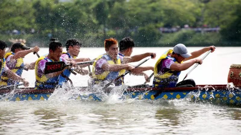 本次龍舟爭霸賽共分為男子、女子兩個組別,競賽項目為男子、女子200米、500米直道競速。活動現場熱鬧非凡,賽事比拼精彩紛呈。在上午進行的決賽中,星湖兩岸吶喊陣陣,彩旗飛舞,湖面浪花飛濺,龍舟競渡,參賽隊員們和著鼓聲號令槳起槳落,一支支龍舟猶如離弦之箭向前疾行,奮勇爭先的向終點沖去。