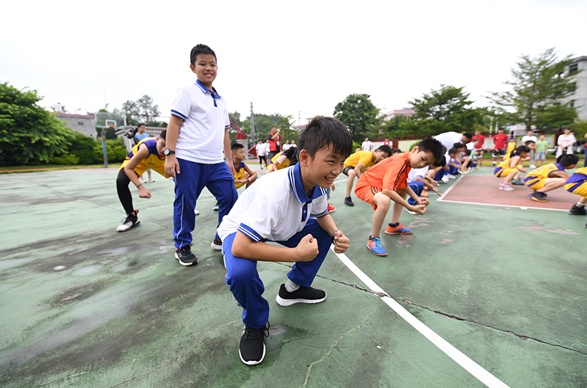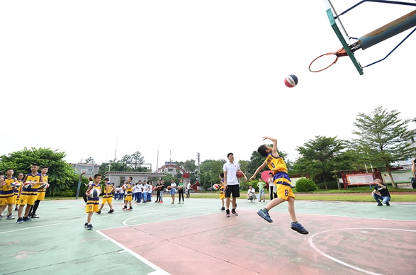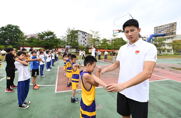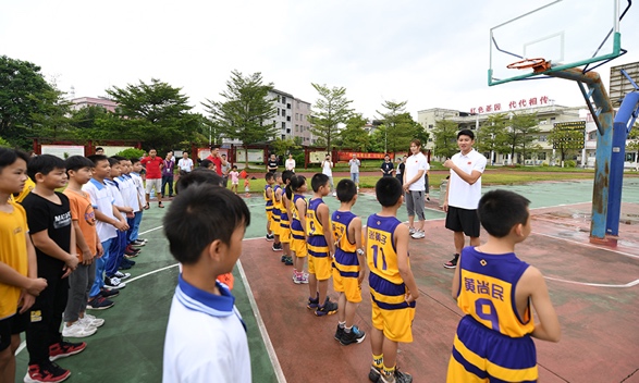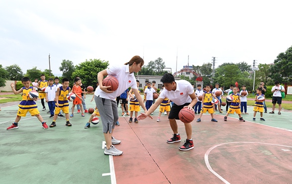 隨后,支教課程進入到有球環節。從最基礎的原地運球,再到較有實戰意義的左右交臂運球、背后運球等,黃文威、陳麗宇親身示范,狠抓細節,手把手教學。臺風將至,天氣悶熱,籃球場上,冠軍教練和孩子揮汗如雨,黃文威不斷地重復示范三步上籃的技術要點,陳麗宇在投籃比拼環節激情吶喊,籃球支教以南粵古驛道定向大賽為載體走進阮嘯仙紅軍小學,其意義不僅僅是專業知識的傳授,更是把籃球夢帶進了這片紅色土壤。