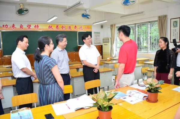 在中山紀念中學,陳旭東聽取學校綜合發展情況匯報,到政治科組教師辦公室慰問教師,了解思政課教學情況;與教師代表座談,聽取他們的工作生活訴求,以及對中山教育事業發展的意見建議。