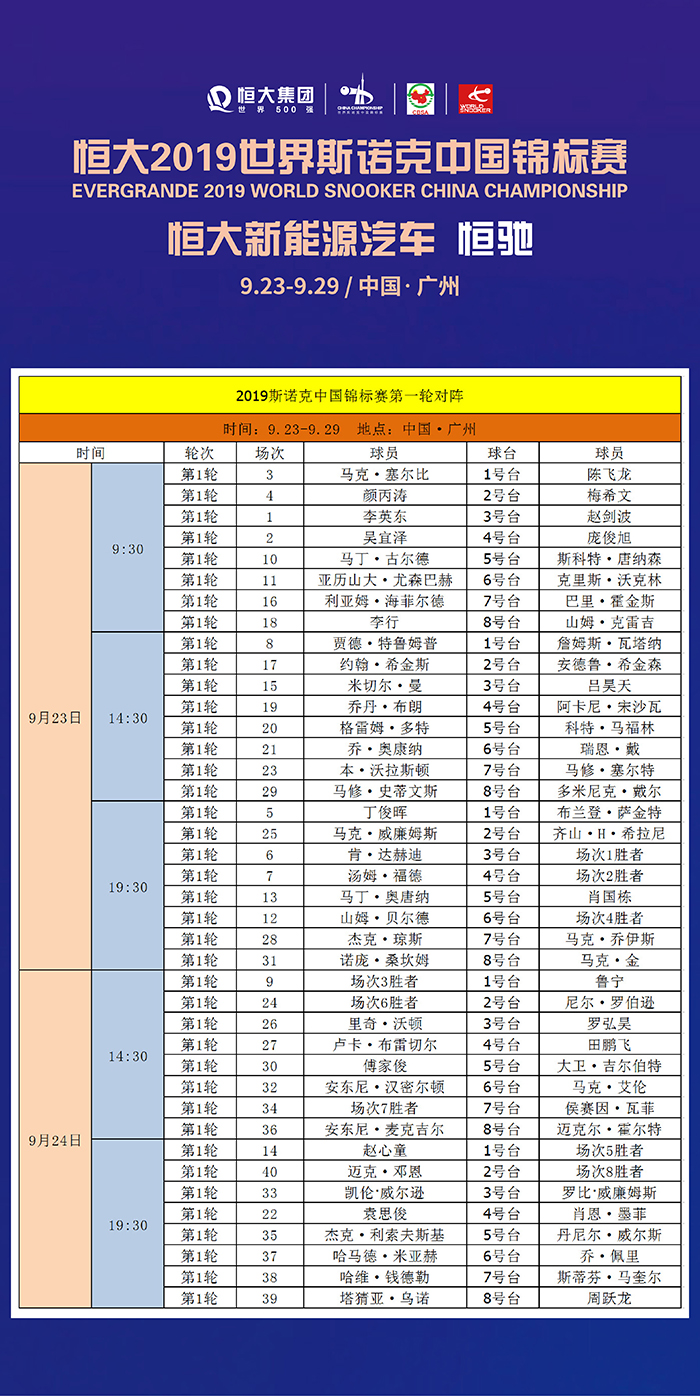 衛冕冠軍塞爾比將亮相23日上午的揭幕戰,特魯姆普、希金斯下午出戰,當晚壓軸戲是丁俊暉的比賽。據悉,首輪票價最低為80元,最高為380元。決賽門票分為5檔,票價從380元到1280元不等。