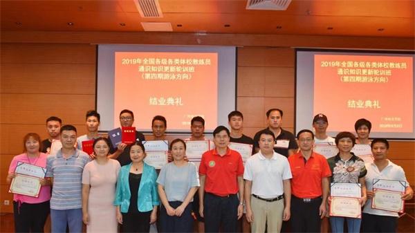 日前,2019年全國各級各類體校教練員通識知識更新輪訓班(第四期游泳方向)結業典禮在廣州體育學院舉行。2019年全國各級各類體校教練員通識知識更新輪訓班(第四期游泳方向)由國家體育總局青少司主辦,由體育總局教練員學院協辦,全國體育運動學校聯合會管理與實施,中國游泳協會參與,由廣東省體育局、廣州體育學院承辦。