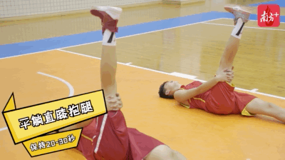 動作注意事項:呼吸自然,可控制范圍才加大牽拉,要求抱的腿膝蓋伸直勾腳尖。