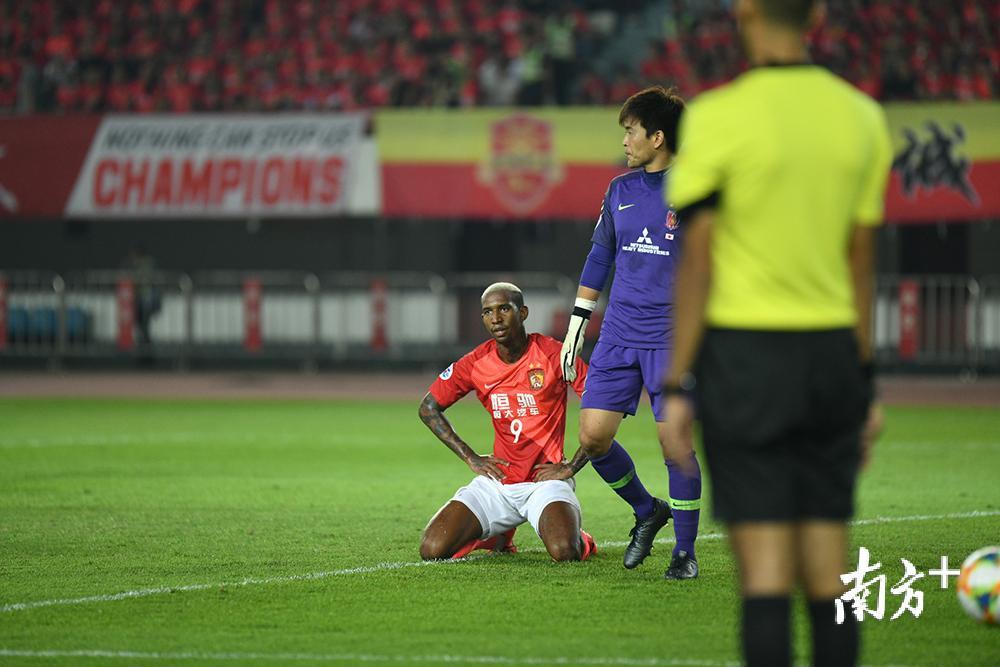 郜林艱難突破。失球后,廣州恒大瘋狂反撲,但依然無法撼動對手防守陣線。