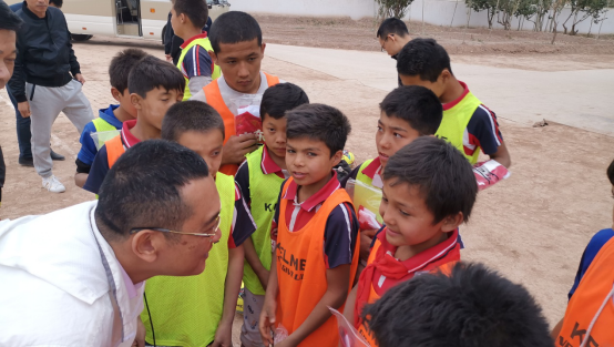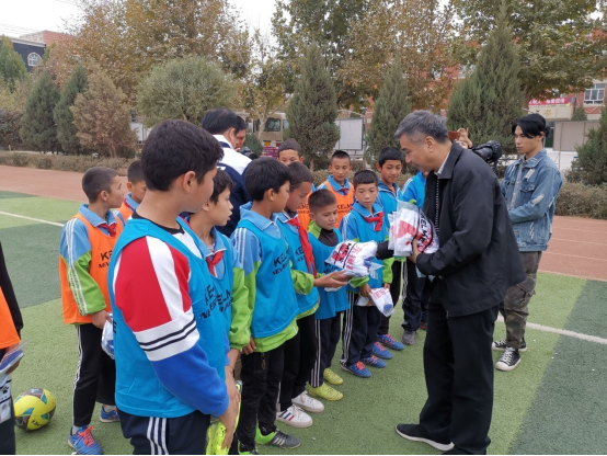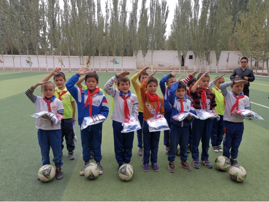 當調研組來到吾庫薩克鎮托萬克吾庫薩克小學的時候,學校的足球隊正在熱火朝天的進行足球訓練,由于學校的場地還是一塊土場,孩子們在塵土飛揚中訓練,雖然條件艱苦,但小隊員們的訓練一點都不放松,當調研組將印有“廣東援疆”字樣的球衣贈送給孩子們時,他們非常有禮貌地齊聲說“謝謝!”學校的小守門員阿布杜拉說:“謝謝廣東足球援疆對我們的鼓勵,將來我要去廣東踢球。”