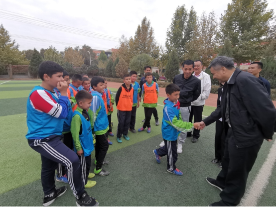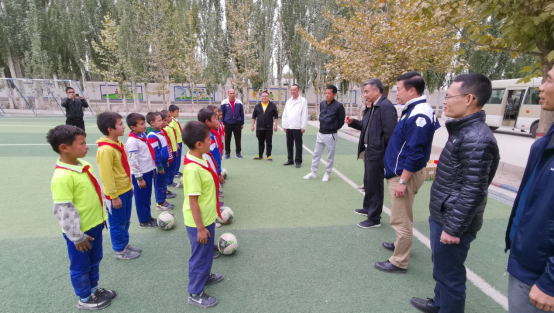 隨后廣東省體育局援疆工作調研組一行來到疏附縣明德小學,這是一所足球特色學校,現在在富力足校踢球的伊木然就是明德小學的學生,他從富力足校的選拔中脫穎而出,被選到富力足校學習踢球。在明德小學訓練場上,調研組遇到了從廣州市天河區啟慧學校到疏附縣明德小學進行足球援疆的許均猛老師,柯國洪副巡視員詢問許均猛老師的訓練和支教情況,并鼓勵他為廣東足球援疆做出貢獻。