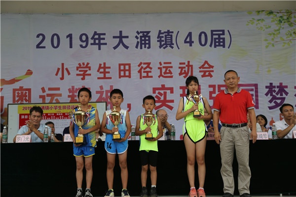 精彩紛呈的運動會一直持續到下午四點。在這一天的時間里,大涌鎮運動員健兒用自己的頑強拼搏、不斷進取詮釋著更高、更強、更快的體育精神。最后,鎮教育事務指導中心主任周景照、宣傳文體服務中心主任梁兆文和鎮教育事務指導中心副主任李樂康先后為各獲獎學校頒獎。大涌南文小學獲得團體總分第一名,旗北小學獲得團體總分第二名,嵐田小學獲得團體總分第三名,安堂小學獲得團體總分第四名。