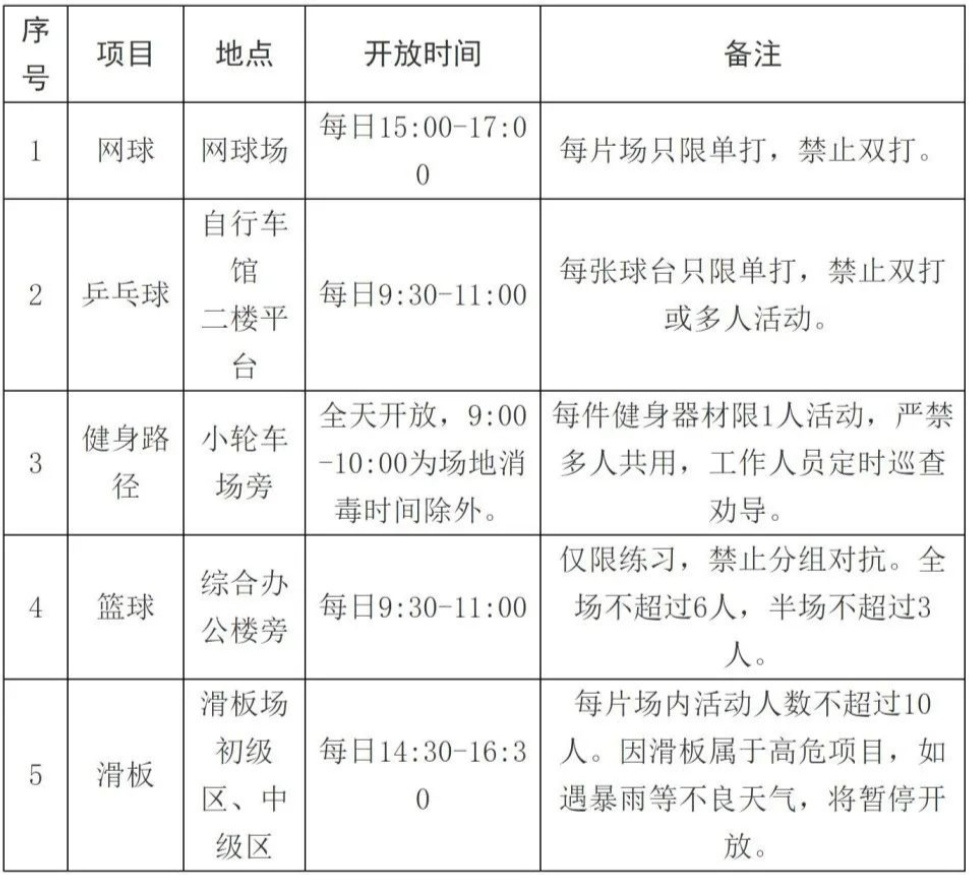 開放區域:網球場、乒乓球館、健身路徑、籃球場、滑板場
