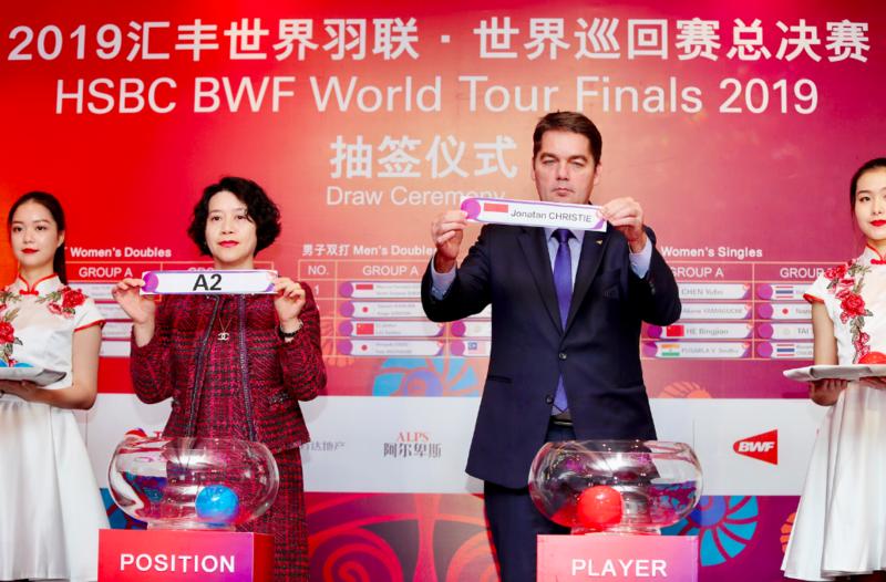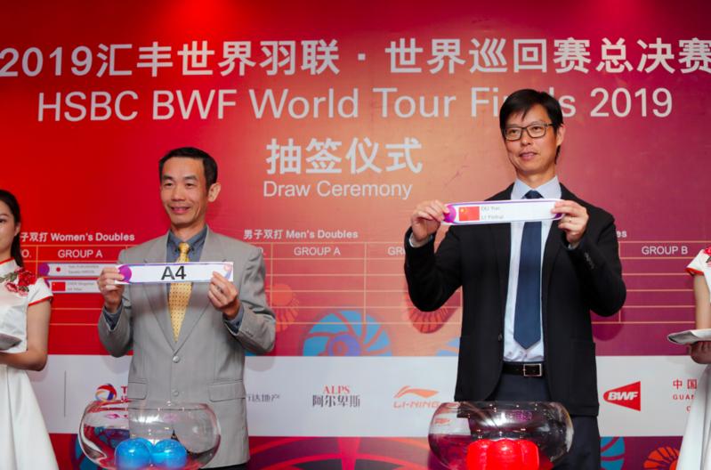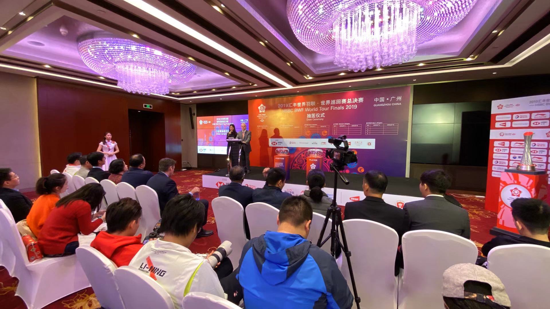 中國隊在強勢項目女單、女雙和混雙實現了滿額參賽,在男單和男雙項目各有一人/對主力入圍。今天上午,廣州總決賽抽簽儀式在官方酒店花園酒店舉行,世界羽聯主席保羅·埃里克·霍耶、中國羽協主席張軍、廣州羽協主席林燕芬、雅典奧運女雙冠軍楊維、中國隊頭號混雙鄭思維/黃雅瓊等出席儀式。霍耶親手抽出男單諶龍與安賽龍同組,屆時B組將上演“雙龍會”。