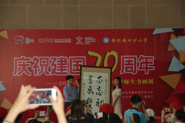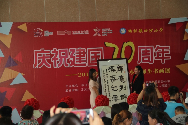 兩位領(lǐng)導(dǎo)的講話為書(shū)畫(huà)展的開(kāi)幕增色添香。接著,舉行了書(shū)畫(huà)贈(zèng)送儀式。在熱烈的掌聲中,“書(shū)壇新秀,畫(huà)藝蓓蕾”、“不忘初心,德藝雙馨”、“千幅書(shū)畫(huà)園丁贊,萬(wàn)卷畫(huà)品育人歌”和“揮毫列錦繡,落紙如云煙”等四幅書(shū)法精品分別被贈(zèng)予中山市文化館和四沙小學(xué)。緊接著各級(jí)領(lǐng)導(dǎo)上臺(tái)進(jìn)行了剪彩。在熱情奔放的音樂(lè)聲和熱烈的掌聲中,禮花綻放——四沙小學(xué)慶祝建國(guó)70周年師生書(shū)畫(huà)展正式開(kāi)幕!
