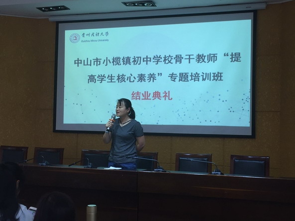 12日上午,貴州民族大學外國語學院黨委書記賀云教授講授了《教師語言藝術》。12日下午,結業典禮在貴州民族大學第五會議室舉行,出席典禮的有貴州民族大學副校長韋維、貴州民族大學外國語學院院長肖唐金、黨委書記賀云、副院長張廣勇。會議首先由五位學員代表分享培訓心得和學習感受。小欖一中郭敏、葉斌、唐娟老師分別談了各自學習的收獲與感受,他們開拓了眼界,而且引發了自己對教育教學深深的思考。肖唐金院長作了結業致辭。肖院長希望學員把培訓所得帶回去,為今后的教育教學工作提供幫助。姚文珍主任代表受訓學校發言。最后,學員們輪流上臺接受校方頒發的結業證書并留影。