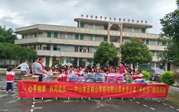 當天,參加活動的水井小學的孩子們集中在學校操場。水井小學的鄧校長首先就他們學校的情況做了一個簡單的介紹。接著,五桂山學校的大隊輔導員姚敏鳳老師發言鼓勵孩子們面對困境要自強不息,刻苦學習,在成長的路上,我們的心手相牽,永遠在一起。隨后,五桂山學校的學生代表和老師為孩子們發放了書包、文具等慰問品,活動在孩子們的笑聲與掌聲中圓滿結束。