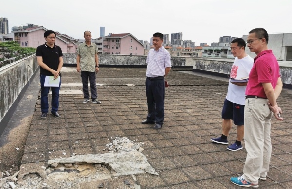李有林副局長強(qiáng)調(diào),此次調(diào)研主要是圍繞學(xué)校近期反映的安全問題,因此調(diào)研活動一開始便直赴反映相關(guān)問題的現(xiàn)場。李有林副局長一行從教學(xué)樓二樓到五樓,逐一查看了學(xué)校反饋的課室天花脫落的課室,又走到天臺頂,仔細(xì)檢查導(dǎo)致天花水泥板脫落的原因。在天臺上,他聽取了謝柏芳校長對體育館天棚安全隱患的介紹,并且現(xiàn)場查看了體育館天棚因銹蝕而張開的大裂縫。局領(lǐng)導(dǎo)一行還走進(jìn)體育館,現(xiàn)場仔細(xì)查驗天棚的銹蝕和滲漏情況。緊接著還前往目前正在圍蔽的學(xué)校宿舍樓,了解學(xué)生住宿情況,聽取了學(xué)校對宿舍安全隱患的介紹。隨后,沿著折桂路和運動場,李有林副局長來到了學(xué)校計劃重建南門的位置,并聽取了謝校長關(guān)于學(xué)校南大門建設(shè)的匯報。