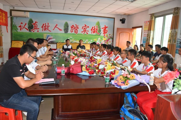 7月29日,華文學校跳繩隊教練和運動員們載譽而歸,橫欄鎮教育事務指導中心霍嘉俊主任、華文學校董事梁耀新、祝和群先生、華文學校謝春生校長以及運動員家長等人到學校門口迎接他們的歸來,并在學校會議室舉行了座談會。
