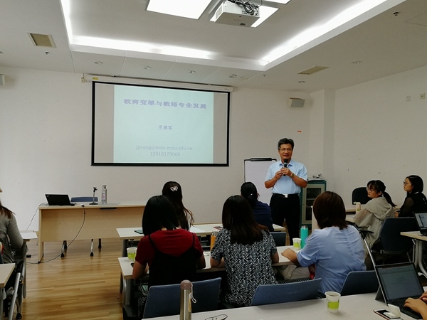 8月24日上午,華東師范大學(xué)教育學(xué)部教育系副教授王建軍以《學(xué)校變革背景下的教師專(zhuān)業(yè)發(fā)展》為題拉開(kāi)了上午講座的帷幕。王教授從當(dāng)代教師為何需要謀求持續(xù)專(zhuān)業(yè)發(fā)展,當(dāng)今教師需要什么的專(zhuān)業(yè)素養(yǎng)及如何提高專(zhuān)業(yè)發(fā)展的實(shí)效這三個(gè)方面剖析教育變革與教師專(zhuān)業(yè)發(fā)展方向。王教授指出:與古代和近代的教育相比,現(xiàn)在的教育發(fā)生了很大的變化,社會(huì)與教育發(fā)展對(duì)教師及其素養(yǎng)提出了新要求,教師要利用現(xiàn)有專(zhuān)業(yè)發(fā)展途徑,促進(jìn)有效的個(gè)人發(fā)展,唯有如此,這樣才能跟上改革的步伐。王教授風(fēng)趣的語(yǔ)言,加上形象生動(dòng)的類(lèi)比,讓學(xué)員們興趣盎然,使學(xué)員們對(duì)自己的專(zhuān)業(yè)發(fā)展有了更深層的理解和思考。