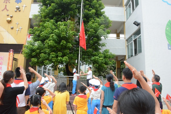 緊接著便是最有意義的主題活動,本次開學典禮以“做國旗衛士,為祖國高歌”為主題,千人接力撫國旗、人人爭做護旗手,每班4名學生高舉國旗從班級隊伍后面往前走,當國旗經過學生頭頂時,學生用雙手深情愛撫。國旗經過前后,學生皆揮舞小國旗致敬。頓時,無數的小五星紅旗在中心廣場上揮舞著,這猶如學生的如火般的愛國熱情。緊接著便是莊嚴而又神圣的升旗儀式,國旗護衛隊的旗手們護衛著鮮艷的五星紅旗入場,他們著裝整齊、步伐矯健。全體行政緊跟在國旗后面。本次升國旗還有一位特殊的升旗手——那就是我們新上任的鄭義富校長。當鄭校長緩緩升起國旗的那一刻,全體少先隊員們向國旗敬禮。升完國旗后,馬上進行開學第一課,主講嘉賓是才華橫溢、可親可愛的鄭校長。他向全體師生提出殷切希望,并結合下雨天給全體師生進行了一次印象深刻的愛國教育。首先鄭校長深情朗誦了愛國詩篇——《我驕傲,我是中國人》,感染了在場的每一位師生。接著,他向全校師生介紹中國版圖區域劃分情況,并讓帶領十多位少先隊員在中國地圖上貼上鮮艷的五星紅旗。最后,在鄭校長的帶領下,全校師生一邊揮動著手中的小紅旗,一邊放聲高歌《我和我的祖國》。頓時,現場是火紅歡樂的一片景象,涌動是全體師生熱情的愛國之心。