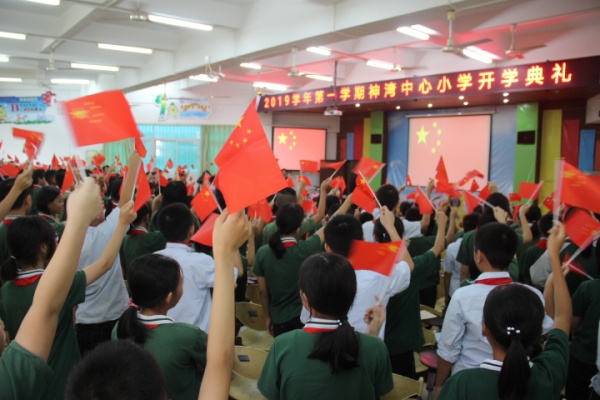 秋雨淅瀝,2019年9月2日上午9點,在莊嚴的國歌聲中以及鮮艷的五星紅旗的映照下,神灣中心小學全體師生歡聚在多媒體室內,舉行了熱烈的秋季開學典禮,共同翻開新學年嶄新的第一頁。