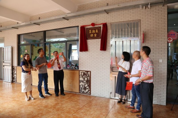 開學典禮的另一項儀式是——吳潤友教室揭牌儀式,儀式由為該校捐贈10萬元教學基金的熱心人士吳潤友,村婦女主任何淑卿女士及全體行政參加,在一(4)班課室前,舉行了揭牌儀式。