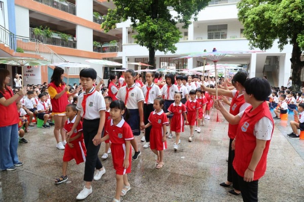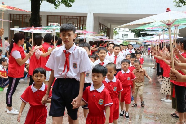 典禮由學校的大隊輔導員杜秋紅老師主持,參加典禮的嘉賓有:新地村委副書記何淑卿、熱心人士吳潤友、鎮禁毒辦社工楊倩萍以及一年級家長志愿者代表等。第一個儀式是閃亮的一年級新生入場。在早已端坐于校園里二至五年級大哥哥大姐姐的掌聲中,在六年級的大哥哥大姐姐的牽引下,一年級的兩百名新成員走進由一年級50位家長志愿者撐起的象征著在成長路上為小朋友遮風擋雨的油紙傘路,進入學校集隊集會的班級位置。整個儀式既熱烈活潑又隆重莊嚴。