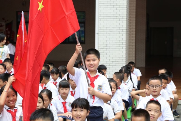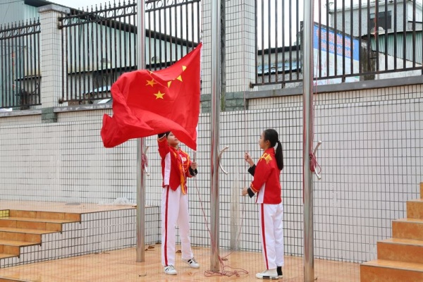 新生入場之后,由吳國有校長宣布開學,并鳴炮,接著進行升旗儀式,校長做《愛我中華》國旗下講話。然后是快閃——《我和我的祖國》,由吳國有校長領唱和合唱隊唱,全校師生同唱。熱烈的歌聲響徹整個校園,學生手中的紅旗鮮艷地飄揚。